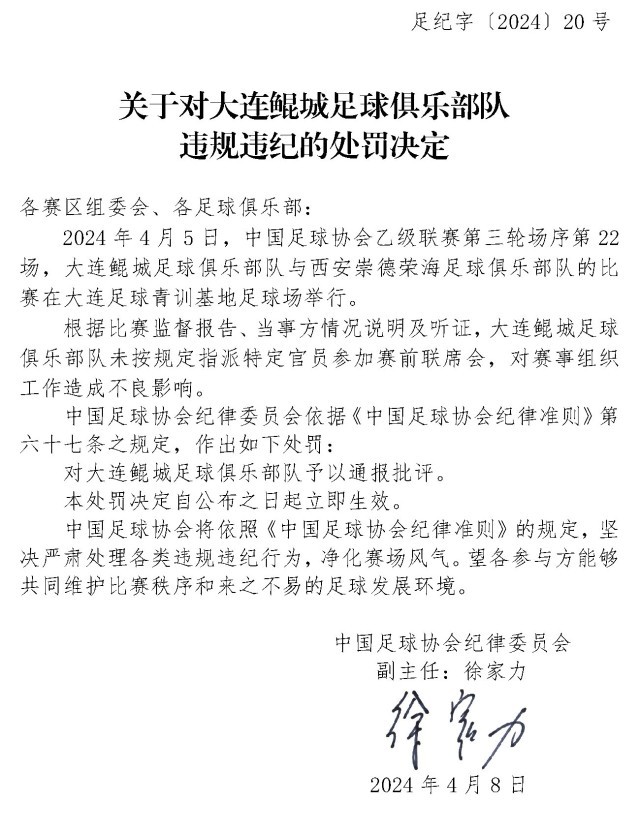央視網(wǎng)消息:4月10日,中國(guó)足協(xié)網(wǎng)站發(fā)布《關(guān)于對(duì)上海嘉定匯龍足球俱樂(lè)部隊(duì)球員時(shí)間違規(guī)違紀(jì)的處罰決定》《關(guān)于對(duì)西安崇德榮海足球俱樂(lè)部隊(duì)違規(guī)違紀(jì)的處罰決定》《關(guān)于對(duì)大連鯤城足球俱樂(lè)部隊(duì)違規(guī)違紀(jì)的處罰決定》三份處罰決定。中甲聯(lián)賽上海嘉定匯龍9號(hào)球員因暴力行為被停賽罰款。中乙聯(lián)賽大連鯤城與西安崇德榮海兩家俱樂(lè)部因未按規(guī)定指派特定官員參加賽前聯(lián)席會(huì),被通報(bào)批評(píng)。