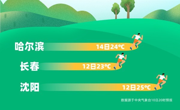 其中,14日黑龍江中東部和吉林東部甚至可能挑戰(zhàn)同期最暖紀(jì)錄。像哈爾濱,14日最高氣溫24℃,較常年同期大幅偏高10℃左右。