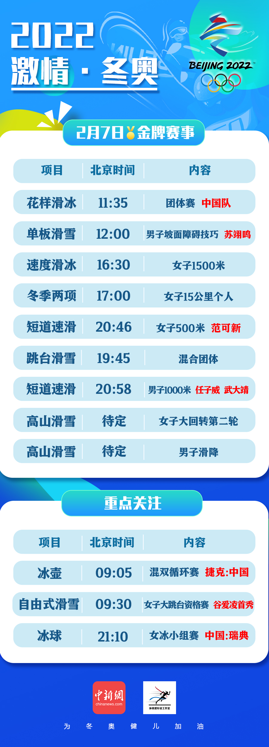 中新網(wǎng)2月7日電 蘇翊鳴爭冠、谷愛凌首秀、中國短道速滑再?zèng)_金、速度滑冰“冬奧獎(jiǎng)牌王”有望擴(kuò)大紀(jì)錄……7日的北京冬奧賽場(chǎng),諸多看點(diǎn)值得期待。