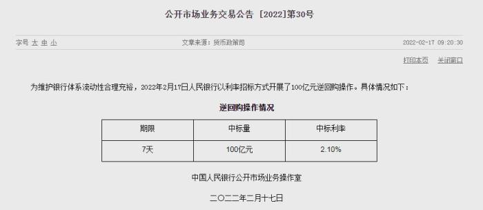 中新財(cái)經(jīng)2月17日電 17日,據(jù)中國(guó)人民銀行官網(wǎng)消息,為維護(hù)銀行體系流動(dòng)性合理充裕,2022年2月17日人民銀行以利率招標(biāo)方式開展了100億元逆回購(gòu)操作,期限為7天,中標(biāo)利率為2.10%。(完)
