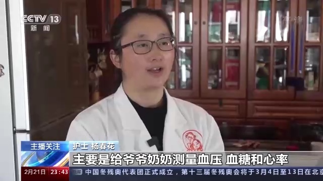 護(hù)士 楊春花:每個(gè)星期來一次的,主要是給爺爺奶奶測(cè)量血壓,血糖和心率,幫他做一下藥物的管理。