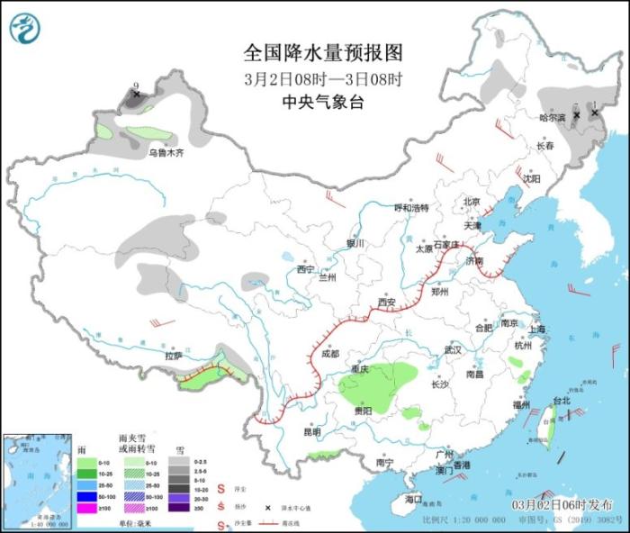 3月2日08時至3日08時,黑龍江東南部、吉林東部、新疆西北部等地部分地區(qū)有小到中雪或雨夾雪,其中,黑龍江東南部、新疆北疆北部等地部分地區(qū)有大雪(5~9毫米)。貴州北部、湖南西北部等地部分地區(qū)有小雨。內(nèi)蒙古中北部、遼寧中部、西藏北部等地部分地區(qū)有4~6級風。