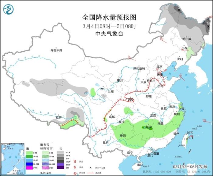 3月4日08時至5日08時,內(nèi)蒙古東北部、東北地區(qū)中北部、西藏東部、青海西部等地部分地區(qū)有小到中雪,其中,黑龍江東北部等地部分地區(qū)有大到暴雪(10~13毫米)。江南大部、貴州大部、廣西中北部等地部分地區(qū)有小到中雨,其中,湖南中部等地部分地區(qū)有大雨。內(nèi)蒙古中東部、東北地區(qū)中南部、河北北部等地部分地區(qū)有4~6級風,其中,內(nèi)蒙古東部部分地區(qū)有6~7級風。