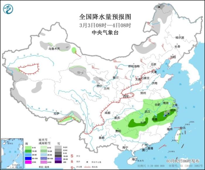 3月3日08時至4日08時,內(nèi)蒙古東北部、黑龍江西北部、新疆沿天山地區(qū)等地部分地區(qū)有小到中雪(2.5~3毫米)。江淮大部、江漢東部、江南大部、西南地區(qū)東南部、廣西東北部等地部分地區(qū)有小到中雨,其中,江西北部、浙江中部等地部分地區(qū)有大雨(25~35毫米)。內(nèi)蒙古、遼寧、新疆東部、陜西北部、山西中部、河北北部、山東半島等地部分地區(qū)有4~6級風,其中,內(nèi)蒙古西北部部分地區(qū)有6~7級風。