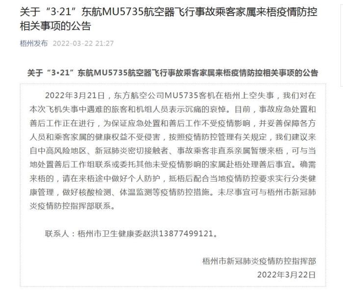 中新網(wǎng)3月22日電 據(jù)“梧州發(fā)布”微信公眾號(hào)消息,3月22日,梧州市新冠肺炎疫情防控指揮部發(fā)布通告稱,2022年3月21日,東方航空公司MU5735客機(jī)在梧州上空失事。目前,事故應(yīng)急處置和善后工作正在進(jìn)行,為保證應(yīng)急處置和善后工作不受疫情影響,并妥善保障各方人員和乘客家屬的健康權(quán)益不受侵害,按照疫情防控管理有關(guān)規(guī)定,我們建議來自中高風(fēng)險(xiǎn)地區(qū)、新冠肺炎密切接觸者、事故乘客非直系親屬暫緩來梧,可與當(dāng)?shù)靥幹蒙坪蠊ぷ鹘M聯(lián)系或委托其他未受疫情影響的家屬赴梧處理善后事宜。