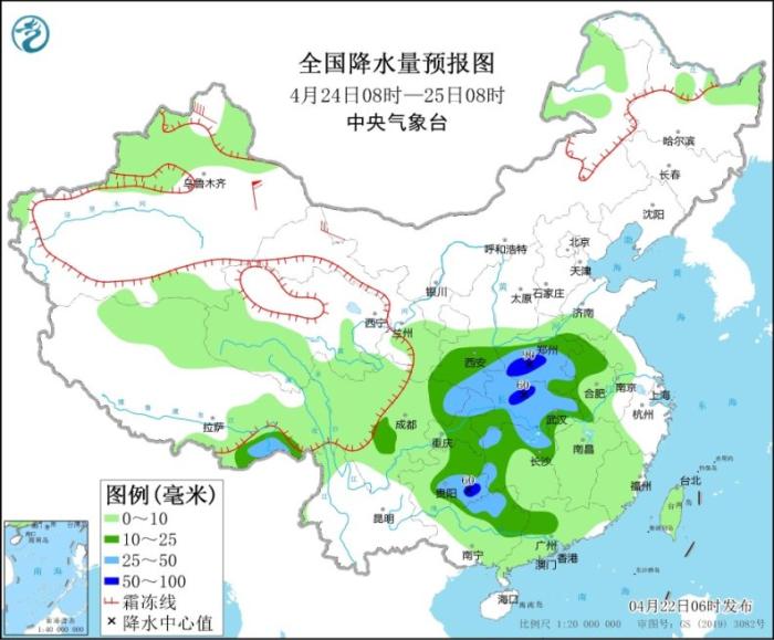 4月24日08時(shí)至25日08時(shí),新疆北疆北部、青海南部、西藏北部等地部分地區(qū)有小到中雪或雨夾雪。西藏東南部、西北地區(qū)東南部、西南地區(qū)東部、黃淮西部、江淮西部、江漢、江南北部、華南北部等地部分地區(qū)有中到大雨,其中,河南西南部、湖北北部、貴州東南部等地部分地區(qū)有暴雨(50~90毫米)。內(nèi)蒙古西北部、新疆北疆北部等地部分地區(qū)有4~6級(jí)風(fēng),其中,新疆東部部分地區(qū)有6~8級(jí)風(fēng)(見(jiàn)圖3)。