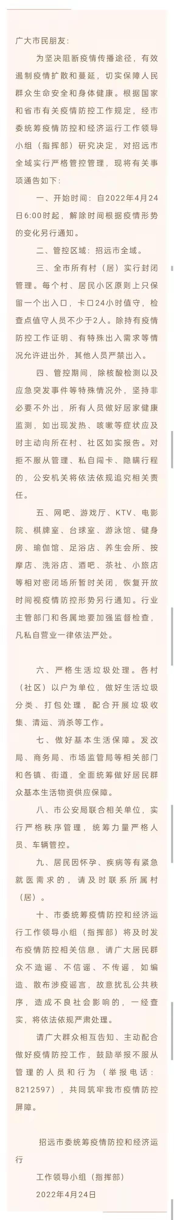 4月24日,山東煙臺(tái)招遠(yuǎn)市委統(tǒng)籌疫情防控和經(jīng)濟(jì)運(yùn)行工作領(lǐng)導(dǎo)小組(指揮部)發(fā)布《關(guān)于全域?qū)嵤﹪?yán)格管控管理的通告》。通告指出,自2022年4月24日6時(shí)起,招遠(yuǎn)市所有村(居)實(shí)行封閉管理。每個(gè)村、居民小區(qū)原則上只保留一個(gè)出入口,卡口24小時(shí)值守,檢查點(diǎn)值守人員不少于2人。除持有疫情防控工作證明、有特殊出入需求等情況允許進(jìn)出外,其他人員嚴(yán)禁出入。