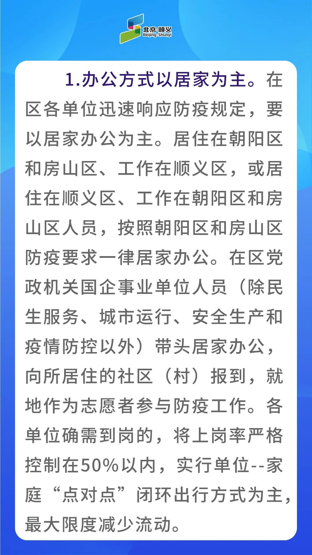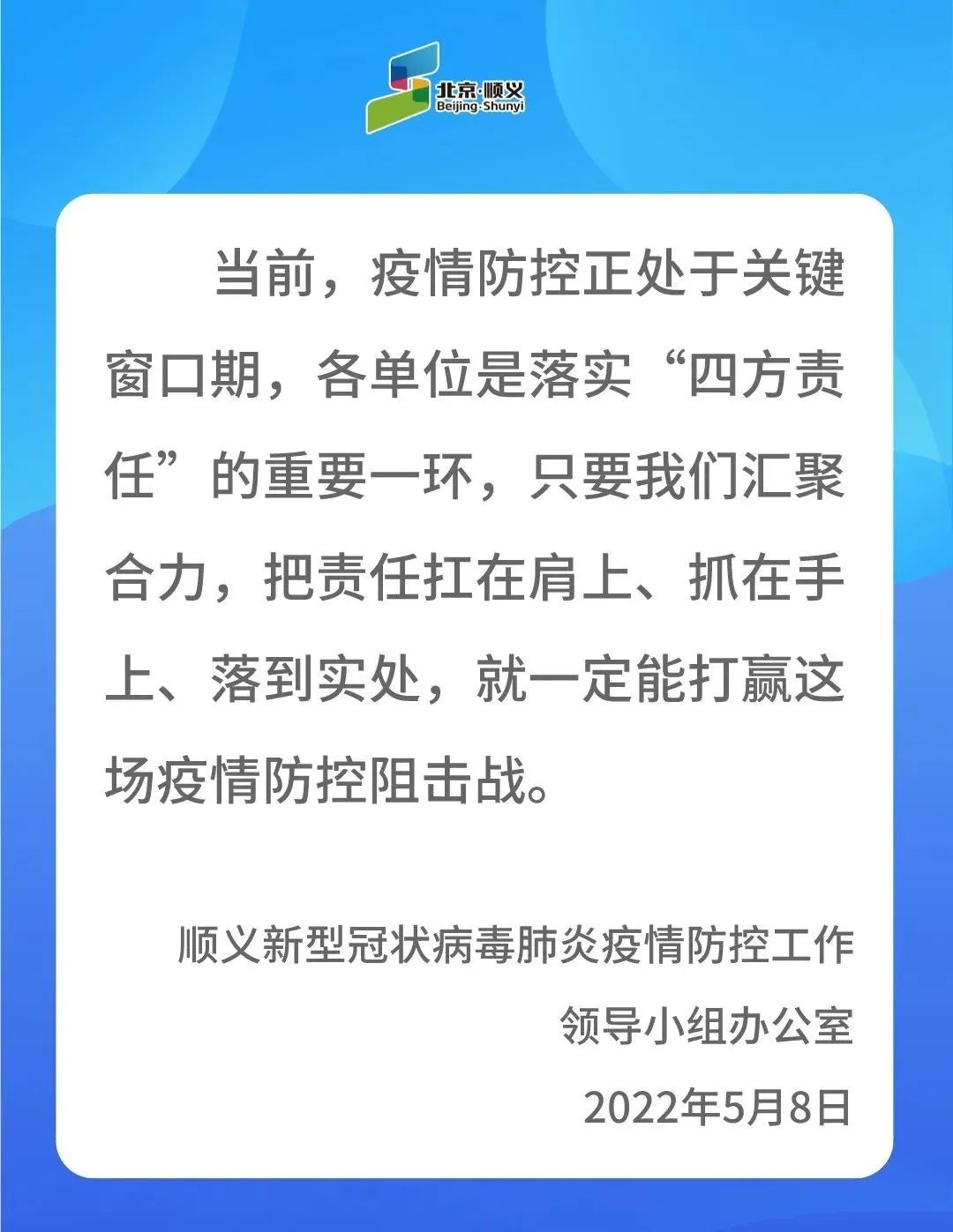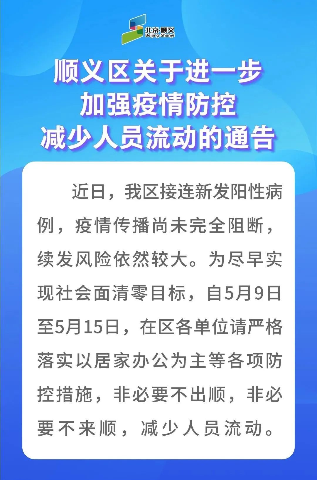 中新網(wǎng)5月8日電 據(jù)“北京順義”微信公眾號消息,5月8日,順義區(qū)發(fā)布《順義區(qū)關(guān)于進一步加強疫情防控減少人員流動的通告》指出,為盡早實現(xiàn)社會面清零目標,自5月9日至5月15日,在區(qū)各單位請嚴格落實以居家辦公為主等各項防控措施,非必要不出順,非必要不來順,減少人員流動。
