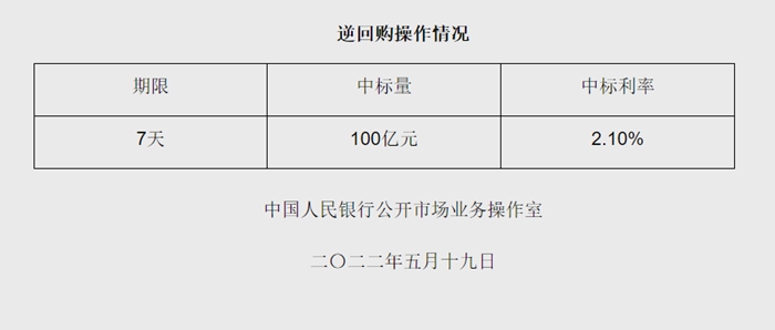 央行5月19日開展100億元逆回購操作 中標(biāo)利率2.10%