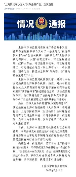 中新財經(jīng)5月19日電 據(jù)“上海市場監(jiān)管”微信公眾號19日消息,上海市市場監(jiān)管局在網(wǎng)絡(luò)廣告監(jiān)測中發(fā)現(xiàn),蔣某在某短視頻平臺發(fā)布了一條主題為“疫情保供專車”的廣告宣傳視頻。經(jīng)查,當(dāng)事人宣稱的所謂“城市預(yù)約保障車”,其實是配有上海市防疫保障(人員保障)臨時通行證、上海市防疫保障(生活物資)臨時通行證等具有專門用途的車輛,不得非法載客。疫情期間,當(dāng)事人為非法牟利,發(fā)布了相關(guān)廣告文案,對外進行攬客。