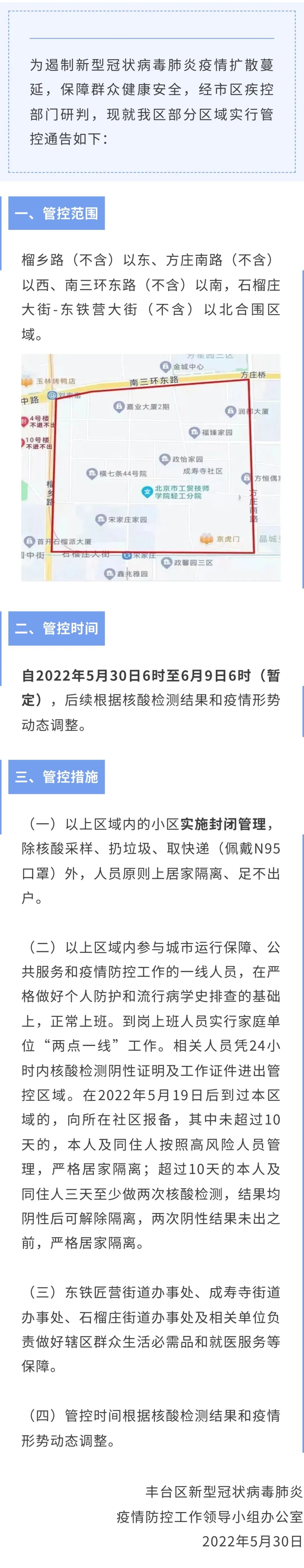 中新網(wǎng)5月30日電 據(jù)“北京豐臺”微信公眾號消息,30日,北京市豐臺區(qū)新型冠狀病毒肺炎疫情防控工作領(lǐng)導(dǎo)小組辦公室發(fā)布關(guān)于部分區(qū)域管控的通告。管控時間自2022年5月30日至6月9日6時,區(qū)域內(nèi)的小區(qū)實(shí)施封閉管理,人員原則上居家隔離、足不出戶。