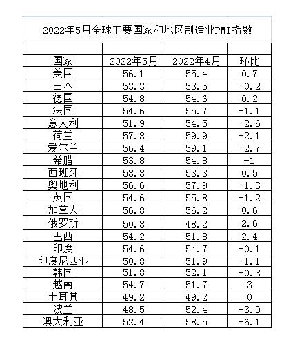 中國物流與采購聯(lián)合會網站發(fā)布的2022年5月份全球主要國家制造業(yè)PMI指數截圖。