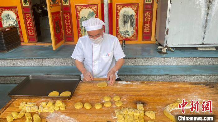 扎著圍裙,戴著廚師帽,個頭不高,說起話來還有點(diǎn)害羞,整個人非常質(zhì)樸。這是記者見到張潤明的第一印象。