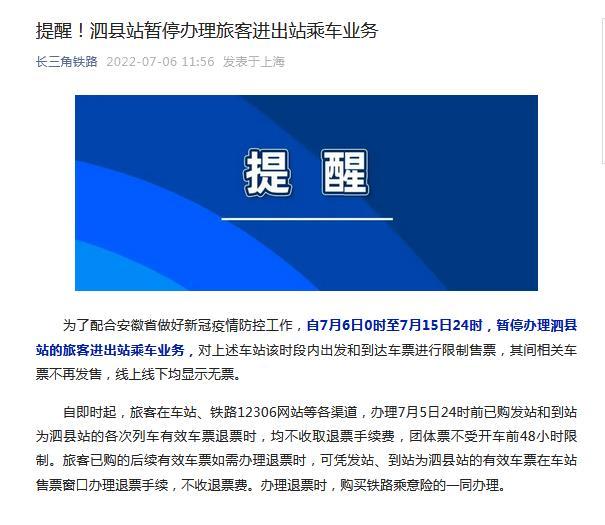 中新網7月6日電 據中國鐵路上海局集團有限公司官方微信消息,為了配合安徽省做好新冠疫情防控工作,自7月6日0時至7月15日24時,暫停辦理泗縣站的旅客進出站乘車業(yè)務,對上述車站該時段內出發(fā)和到達車票進行限制售票,其間相關車票不再發(fā)售,線上線下均顯示無票。