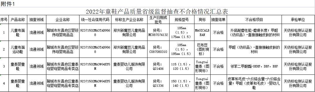不合格產(chǎn)品涉及:鄭州新魔豆兒童用品有限公司生產(chǎn)的“MAGICALBEAN”牌兒童布面鞋、鄭州新魔豆兒童用品有限公司生產(chǎn)的“巴布豆”牌兒童布面運動鞋、2批次童泰嬰幼兒服飾有限公司生產(chǎn)的“Tongtai童泰”牌童泰嬰童鞋。