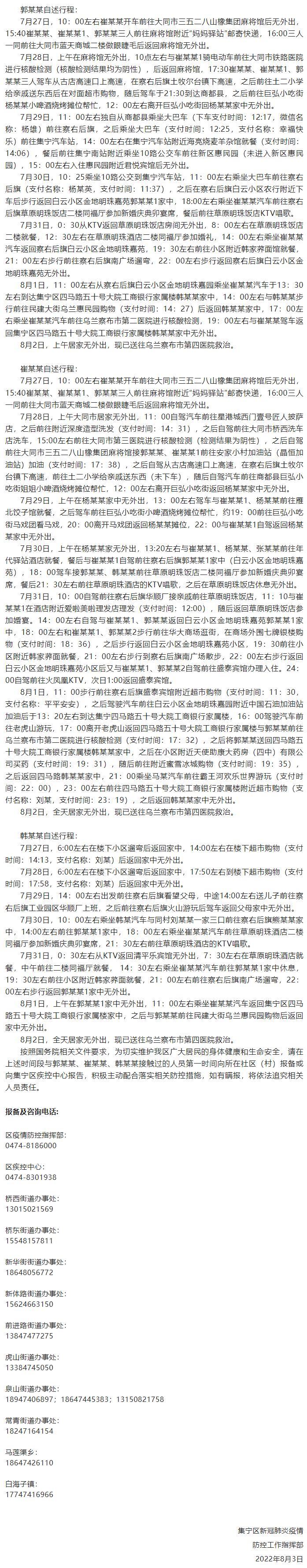 2022年8月2日,內(nèi)蒙古烏蘭察布市集寧區(qū)在居民“愿檢盡檢”中發(fā)現(xiàn)一管混檢異常樣本,隨即對所有混檢人員進行單采單檢,其中大同市前來集寧區(qū)人員郭某某為初篩陽性,同時對郭某某同行同住人員進行核酸檢測,同行同住人員崔某某、韓某某為初篩陽性,目前此3例初篩陽性人員均已轉(zhuǎn)運至定點救治醫(yī)院,現(xiàn)將3人的行程軌跡公布如下: