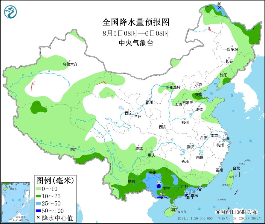 8月5日08時(shí)至6日08時(shí),黑龍江北部、廣東中西部、廣西、貴州南部、云南中東部、西藏東南部等地部分地區(qū)有中到大雨,其中,廣東南部沿海、廣西西南部等地局部地區(qū)有暴雨(50~80毫米)。甘肅西部、內(nèi)蒙古東北部、新疆南疆盆地等地部分地區(qū)有4~6級風(fēng)。