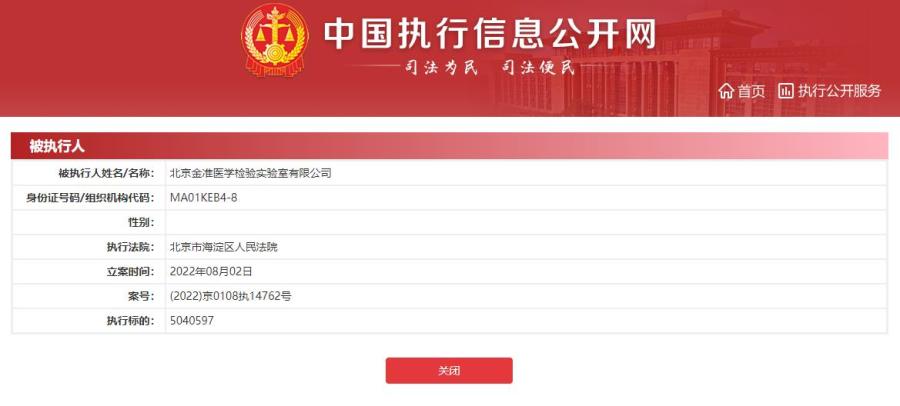 北京金準醫(yī)學(xué)實驗室成被執(zhí)行人 執(zhí)行標的504萬