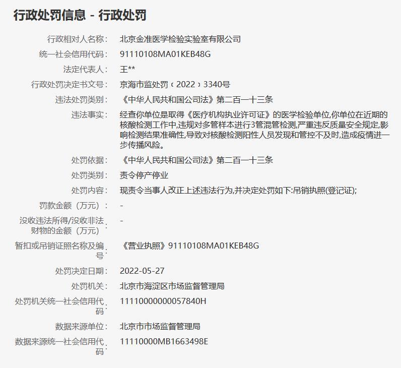 據(jù)信用中國(北京)網(wǎng)站5月31日行政處罰信息顯示,北京金準醫(yī)學(xué)檢驗實驗室有限公司在近期的核酸檢測工作中,違規(guī)對多管樣本進行3管混管檢測,嚴重違反質(zhì)量安全規(guī)定,影響檢測結(jié)果準確性,導(dǎo)致對核酸檢測陽性人員發(fā)現(xiàn)和管控不及時,造成疫情進一步傳播風(fēng)險。北京市海淀區(qū)市場監(jiān)督管理局決定吊銷其執(zhí)照(登記證)。(中新財經(jīng))