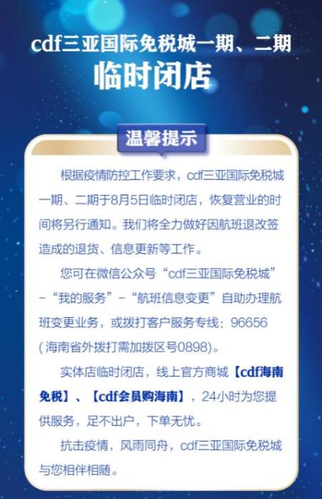 三亞國(guó)際免稅城一期、二期8月5日起臨時(shí)閉店