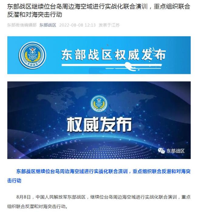 中新網(wǎng)8月8日電 據(jù)東部戰(zhàn)區(qū)微信公眾號(hào)消息,8月8日,中國人民解放軍東部戰(zhàn)區(qū)繼續(xù)位臺(tái)島周邊??沼蜻M(jìn)行實(shí)戰(zhàn)化聯(lián)合演訓(xùn),重點(diǎn)組織聯(lián)合反潛和對(duì)海突擊行動(dòng)。