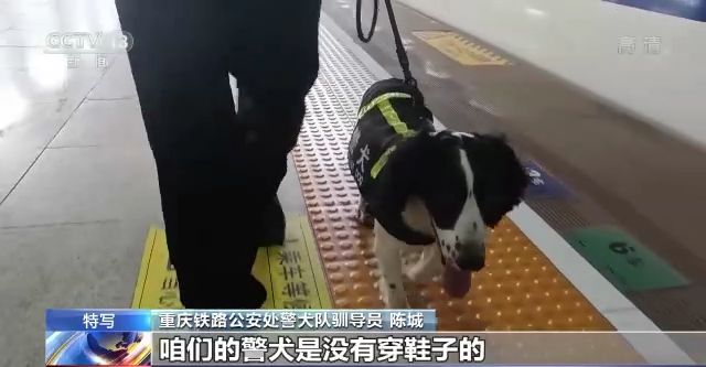 重慶鐵路公安處警犬隊(duì)馴導(dǎo)員 陳城:現(xiàn)在地表溫度是非常高的,你看現(xiàn)在都是接近60℃了,咱們的警犬是沒(méi)有穿鞋子的,相當(dāng)于就是(它的)肉墊直接接觸地面,它是非常痛苦的,所以咱們(正午)基本上不會(huì)在室外工作了。