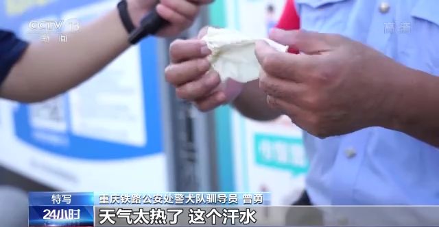 重慶鐵路公安處警犬隊(duì)馴導(dǎo)員 曾勇:天氣太熱了,這個(gè)汗水。這個(gè)手套不透氣,主要是天氣太熱了。