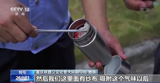 重慶鐵路公安處警犬隊(duì)馴導(dǎo)員 曾勇:這是我們訓(xùn)練用的乳化炸藥,然后我們這里面有紗布,吸附這個(gè)氣味后,就可以放在箱子里面,然后讓搜爆犬來(lái)進(jìn)行搜尋。如果它坐下或者臥下示警的話,就表示這個(gè)箱子里有危險(xiǎn)品。