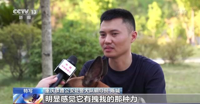 重慶鐵路公安處警犬隊(duì)馴導(dǎo)員 陳城:有一次我們出去找一個(gè)人的時(shí)候,在山林里搜救,我在行進(jìn)的途中不小心差點(diǎn)摔下去了,因?yàn)樽е?閃電的)警繩,明顯感覺(jué)它有拽我的那種力,把我拖上去的感覺(jué)挺感動(dòng)的,當(dāng)時(shí)內(nèi)心有一顫。