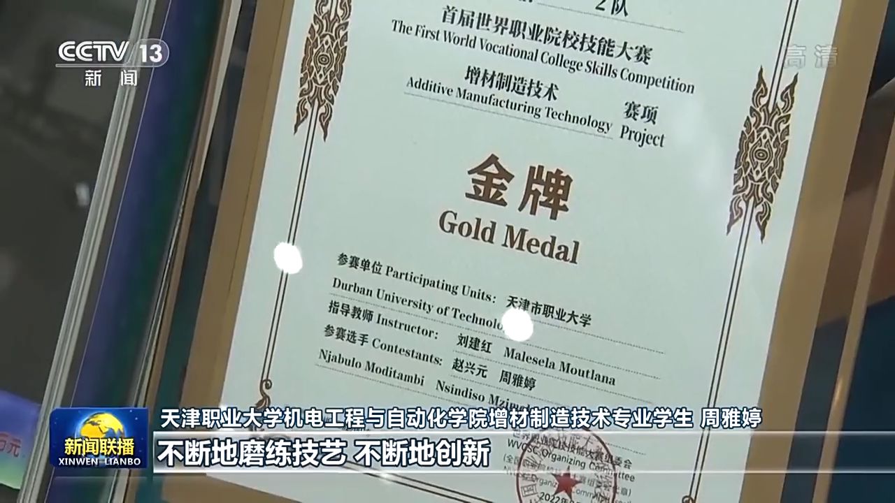 天津職業(yè)大學(xué)機電工程與自動化學(xué)院增材制造技術(shù)專業(yè)學(xué)生 周雅婷:我覺得我是這個時代的幸運兒,在(學(xué)校)實訓(xùn)基地,其實每天都是實戰(zhàn),我們的老師也是技能大師。以前我覺得大國重器是高不可攀的,當(dāng)我站在世界級的領(lǐng)獎臺上,我才發(fā)現(xiàn),將平凡做到極致,不斷地磨煉技藝、不斷地創(chuàng)新,也是在為制造大國重器蓄積力量。