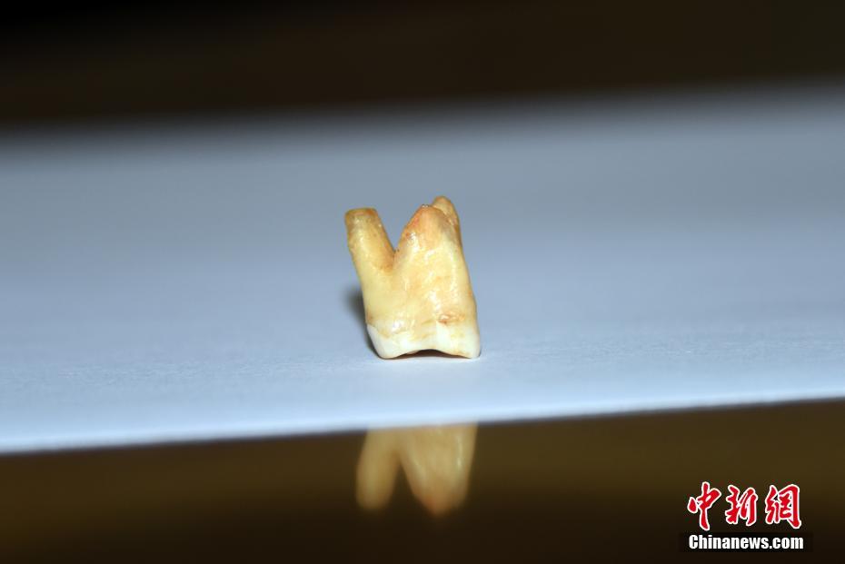 中國(guó)科學(xué)院古脊椎動(dòng)物與古人類研究所(中科院古脊椎所)青年研究員吳妍帶領(lǐng)的研究團(tuán)隊(duì),通過對(duì)湖南道縣福巖洞遺址出土的、迄今所知東亞最早現(xiàn)代人(8-12萬(wàn)年前)的牙齒化石進(jìn)行牙結(jié)石提取與分析,最新研究發(fā)現(xiàn)東亞最早現(xiàn)代人植物類食物的直接證據(jù),并發(fā)現(xiàn)當(dāng)時(shí)的古人類就已經(jīng)有了剔牙行為。這項(xiàng)重要研究發(fā)現(xiàn)的成果論文,已在國(guó)際專業(yè)學(xué)術(shù)期刊《植物科學(xué)前沿》發(fā)表。圖為9月7日,北京,中科院古脊椎所標(biāo)本館,展示一顆用于本次研究的湖南道縣福巖洞遺址出土、8-12萬(wàn)年前東亞最早現(xiàn)代人牙齒化石標(biāo)本。 中新社記者 孫自法 攝