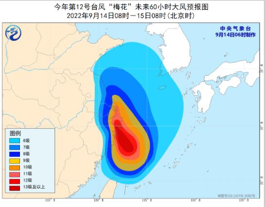 大風預(yù)報:9月14日08時至15日08時,東海大部及釣魚島附近海域、黃海中南部海域、長江口區(qū)、杭州灣以及臺灣島北部沿海、福建北部沿海、山東南部沿海、浙江東部、上海、江蘇東部沿海和地區(qū)將有6-8級大風,陣風9-11級,其中東海中西部海域、浙江中北部沿海、上海沿海、江蘇東南部沿海、杭州灣、長江口區(qū)將有9-11級大風,陣風12-14級,“梅花”中心經(jīng)過的附近海面或地區(qū)的風力有12-14級,陣風可達15-16級。
