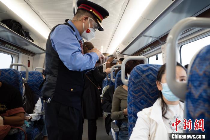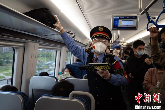 “請(qǐng)保管好自身財(cái)物,看管好小孩,照顧好老人,上下車注意腳下安全?!睌?shù)百名乘客陸續(xù)上車后,鐘靜開始在車廂里巡視。疫情防控期間,他要提醒大家戴好口罩。遇到行李架上行李擺放不規(guī)范,他要?jiǎng)邮终怼M瑫r(shí),他還負(fù)責(zé)整列4節(jié)車廂的查票、補(bǔ)票工作。