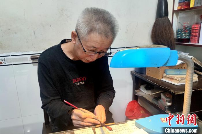 藍(lán)田張氏毛筆制作技藝非遺傳承人張才枝在為剛做好的毛筆刻字。 吳冠標(biāo) 攝