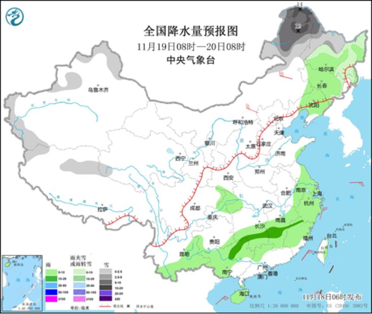 11月18日08時至19日08時,內(nèi)蒙古中東部、黑龍江西部、河北北部等地部分地區(qū)有小到中雪或雨夾雪,其中,內(nèi)蒙古東北部部分地區(qū)有中到大雪(5~8毫米)。華北西部、黃淮、江淮、江漢、江南、西南地區(qū)東部、華南西部等地部分地區(qū)有小到中雨,其中,廣西西北部、湖南東部、江西中部、浙江南部等地部分地區(qū)有大雨。內(nèi)蒙古中部部分地區(qū)有5~6級風(fēng)(見圖2)。東海北部海域?qū)⒂?~7級、陣風(fēng)8級的偏東風(fēng)。