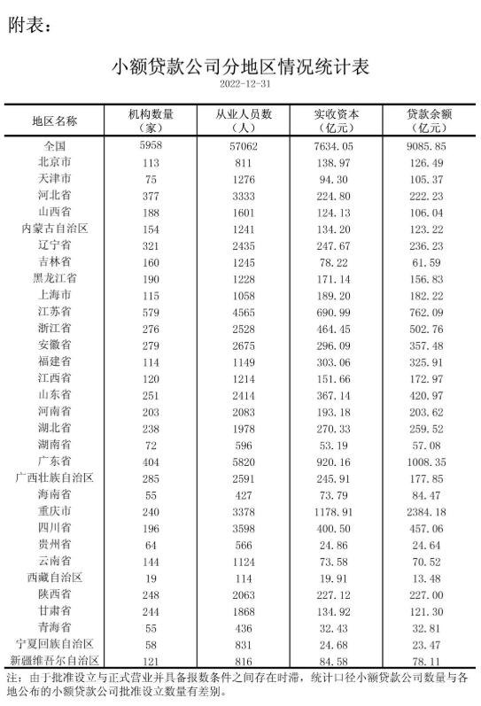 央行:截至2022年12月末全國(guó)共有小額貸款公司5958家