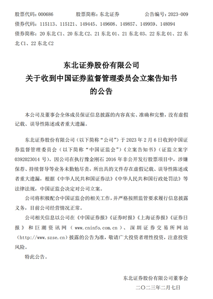 中新網(wǎng)2月7日電 7日,東北證券發(fā)公告稱,東北證券股份有限公司于2023年2月6日收到中國(guó)證券監(jiān)督管理委員會(huì)《立案告知書(shū)》(證監(jiān)立案字 0392023014 號(hào))。因公司在執(zhí)行豫金剛石2016年非公開(kāi)發(fā)行股票項(xiàng)目中,涉嫌保薦、持續(xù)督導(dǎo)等業(yè)務(wù)未勤勉盡責(zé),所出具的文件存在虛假記載、誤導(dǎo)性陳述或者重大遺漏,根據(jù)相關(guān)法律法規(guī),中國(guó)證監(jiān)會(huì)決定對(duì)公司立案。(中新財(cái)經(jīng))
