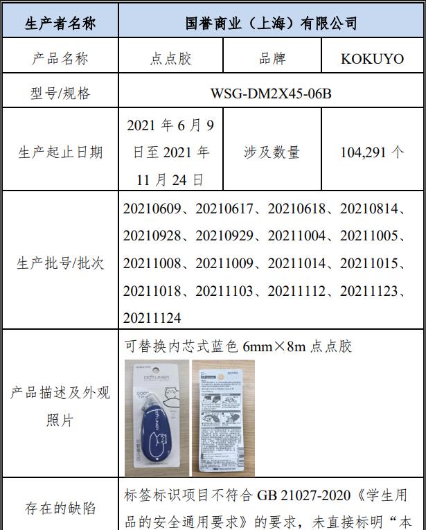 中新網(wǎng)2月20日電 據(jù)上海市場監(jiān)管微信公眾號20日消息,國譽商業(yè)(上海)有限公司自2023年2月20日至2023年5月19日,召回2021年6月9日至2021年11月24日生產(chǎn)的20210609等17個批號;型號為WSG-DM2X45-06B的“KOKUYO”點點膠,涉及104,291個。