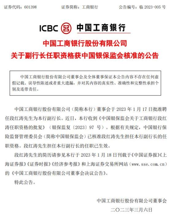 工商銀行6日發(fā)布公告稱,董事會于2023年1月17日批準聘任段紅濤為副行長。近日,工商銀行收到《中國銀保監(jiān)會關于工商銀行段紅濤任職資格的批復》。根據(jù)有關規(guī)定,中國銀保監(jiān)會已核準段紅濤擔任工商銀行副行長的任職資格。段紅濤先生擔任工商銀行副行長的任職已生效。