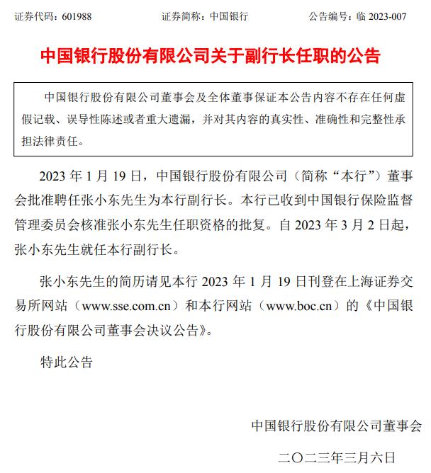 中國銀行6日發(fā)布的公告顯示,2023年1月19日,中國銀行董事會批準聘任張小東為該行副行長。該行已收到銀保監(jiān)會核準張小東任職資格的批復。自2023年3月2日起,張小東就任中國銀行副行長。