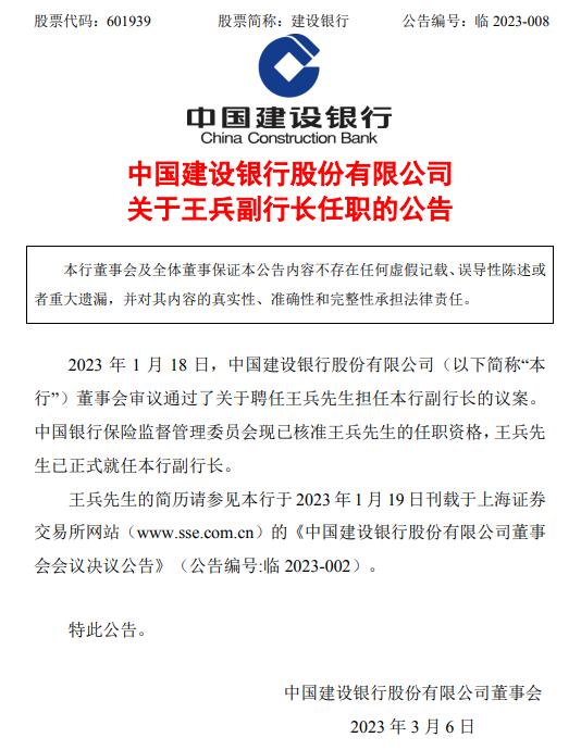 建設銀行6日發(fā)布的公告顯示,2023年1月18日,建設銀行董事會審議通過了關于聘任王兵擔任建設銀行副行長的議案。中國銀保監(jiān)會現(xiàn)已核準王兵的任職資格,王兵已正式就任建設銀行副行長。