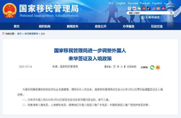 中新網(wǎng)3月14日電 據(jù)國家移民管理局網(wǎng)站消息,為更好統(tǒng)籌疫情防控和經(jīng)濟(jì)社會發(fā)展需要,便利中外人員往來,國家移民管理局決定自2023年3月15日零時起調(diào)整簽證及入境政策。