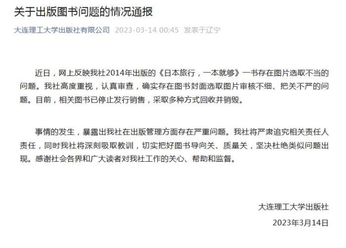 中新網(wǎng)3月14日電 據(jù)大連理工大學(xué)出版社有限公司官方微信消息,大連理工大學(xué)出版社14日發(fā)布情況通報(bào)稱,近日,網(wǎng)上反映大連理工大學(xué)出版社2014年出版的《日本旅行,一本就夠》一書存在圖片選取不當(dāng)?shù)膯栴}。該社高度重視,認(rèn)真審查,確實(shí)存在圖書封面選取圖片審核不細(xì)、把關(guān)不嚴(yán)的問題。目前,相關(guān)圖書已停止發(fā)行銷售,采取多種方式回收并銷毀。