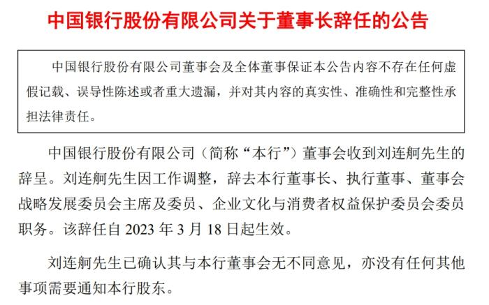 中新網(wǎng)3月19日電 19日晚間,中國銀行發(fā)布公告,公司董事會收到劉連舸的辭呈。劉連舸因工作調(diào)整,辭去中國銀行董事長、執(zhí)行董事、董事會戰(zhàn)略發(fā)展委員會主席及委員、企業(yè)文化與消費者權(quán)益保護委員會委員職務。該辭任自2023年3月18日起生效。(中新財經(jīng))