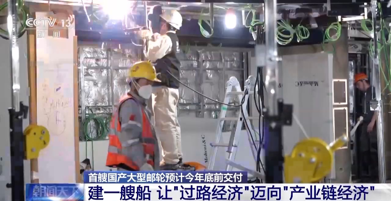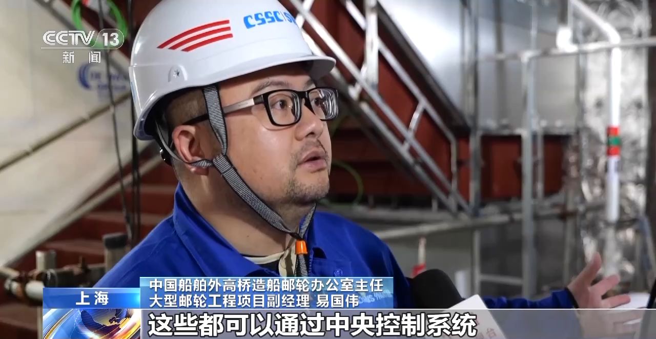 中國船舶外高橋造船郵輪辦公室主任 大型郵輪工程項目副經(jīng)理 易國偉:電纜要提供控制信號,這條船它也是智能化的一條船舶,所有上面用的娛樂設施、照明設施,都可以通過中央控制系統(tǒng)來控制。