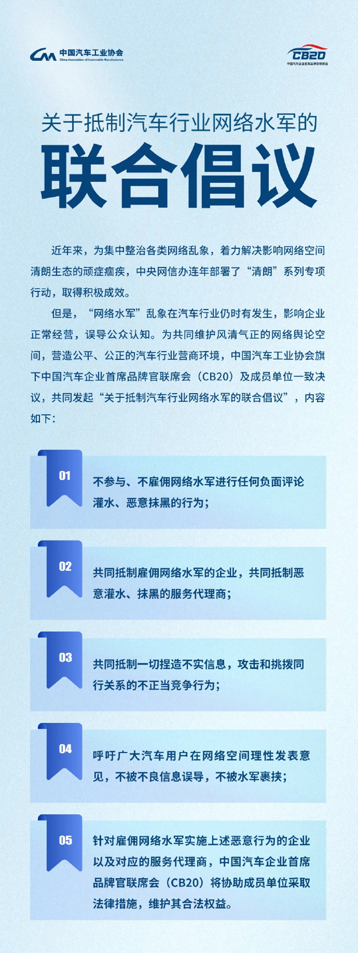 中新網(wǎng)3月24日電(中新財經(jīng) 葛成) 24日,中新財經(jīng)從中汽協(xié)獲悉,為共同維護風清氣正的網(wǎng)絡輿論空間,營造公平、公正的汽車行業(yè)營商環(huán)境,中國汽車工業(yè)協(xié)會旗下中國汽車企業(yè)首席品牌官聯(lián)席會(CB20)及成員單位一致決議,共同發(fā)起“關于抵制汽車行業(yè)網(wǎng)絡水軍的聯(lián)合倡議”。