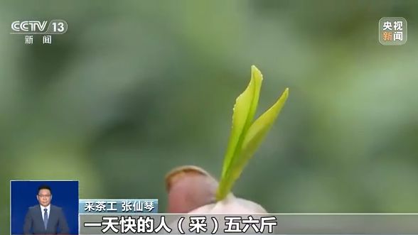 采茶工 張仙琴:我采茶差不多有二十七八年了,這個(gè)嫩芽(采摘)我們手工采的話,一天快的人(采)五六斤,慢的人(采)兩斤多。
