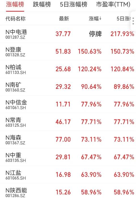 截至發(fā)稿時(shí),N中電港停牌,N登康漲幅150.63%,N柏誠(chéng)漲幅120.24%、N南礦漲幅90.64%,N中信金、N常青、N海森、N中重、N江鹽、N陜西能保持強(qiáng)勢(shì)上漲。