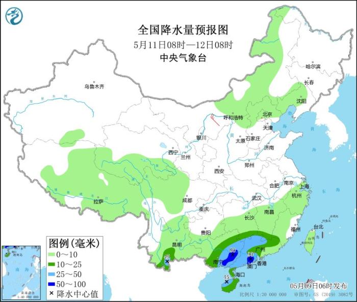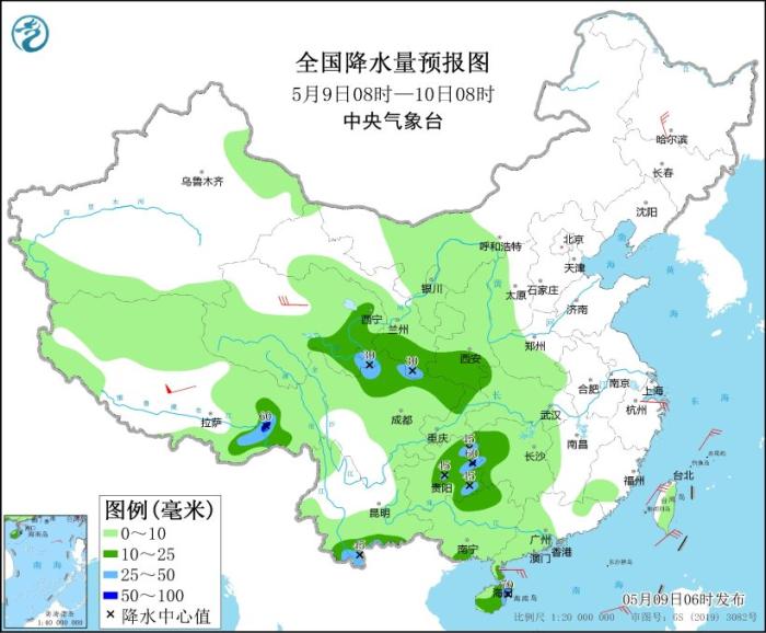 全國降水量預(yù)報圖(5月9日08時-10日08時)