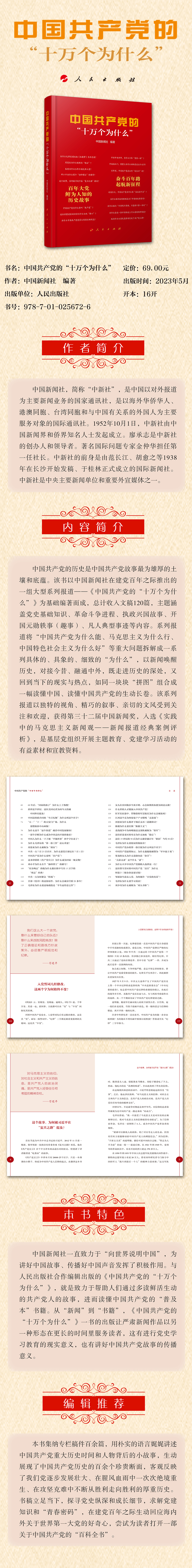 中國(guó)共產(chǎn)黨的歷史是中國(guó)共產(chǎn)黨故事最為雄厚的土壤和底蘊(yùn)。該書(shū)以中國(guó)新聞社在建黨百年之際推出的一組大型系列報(bào)道——《中國(guó)共產(chǎn)黨的“十萬(wàn)個(gè)為什么”》為基礎(chǔ)編著而成,總計(jì)收入文稿120篇,主題涵蓋黨史基礎(chǔ)知識(shí)、革命斗爭(zhēng)進(jìn)程、執(zhí)政興國(guó)故事、開(kāi)國(guó)元?jiǎng)纵W事(趣事)、凡人典型事跡等內(nèi)容。系列報(bào)道將“中國(guó)共產(chǎn)黨為什么能、馬克思主義為什么行、中國(guó)特色社會(huì)主義為什么好”等重大問(wèn)題拆解成一系列具體的、具象的、細(xì)致的“為什么”,以新聞喚醒歷史,對(duì)接今昔、融通中外,既走進(jìn)歷史的深處,又回到當(dāng)下的現(xiàn)實(shí)與熱點(diǎn),如同一塊塊“拼圖”組合成一幅讀懂中國(guó)、讀懂中國(guó)共產(chǎn)黨的生動(dòng)長(zhǎng)卷。該系列報(bào)道以獨(dú)特的視角、精巧的敘事、親切的文風(fēng)受到關(guān)注和歡迎,獲得第三十二屆中國(guó)新聞獎(jiǎng),入選《實(shí)踐中的馬克思主義新聞?dòng)^——新聞報(bào)道經(jīng)典案例評(píng)析》,是基層黨組織開(kāi)展主題教育、黨建學(xué)習(xí)活動(dòng)的有益素材和宣教資料。